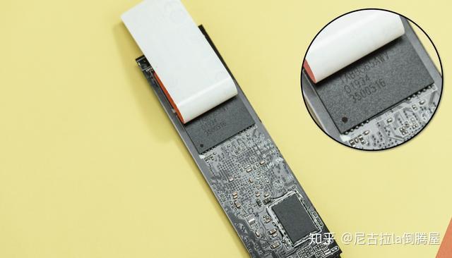 首先将标签一面撕至一半。此时我们可以看到一枚来自SK海力士的DDR4 2400MHz 512MB的内存颗粒缓存,型号为“H5AN4G8NBJR”。两面PCB板均各有一枚,组成1 GB的DRAM缓存空间。