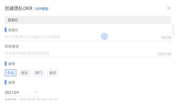 OKR模版中包含各行业各职能的OKR模版,能帮助您更好的制定OKR;创建面板主要有目标O和关键结果KR,每个目标跟随3-5个关键结果。