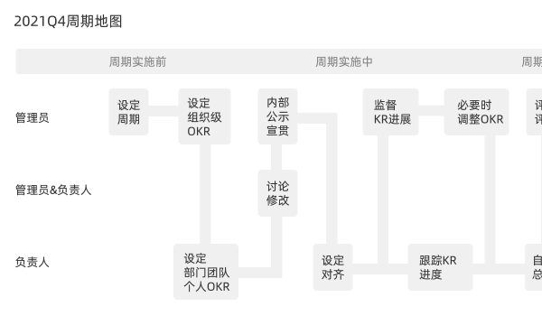 为您带来完整的OKR周期,促进OKR落地;一个周期分为实施前、实施中和实施后三个阶段,通过周期地图了解现在所处的阶段。