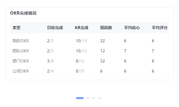 工作台为您提供最新信息、简报,以便快速地掌握周期目标完成情况;包含板块包括OKR完成情况、待办、团队成OKR完成情况、团队成员目标进度饼图、周期地图。