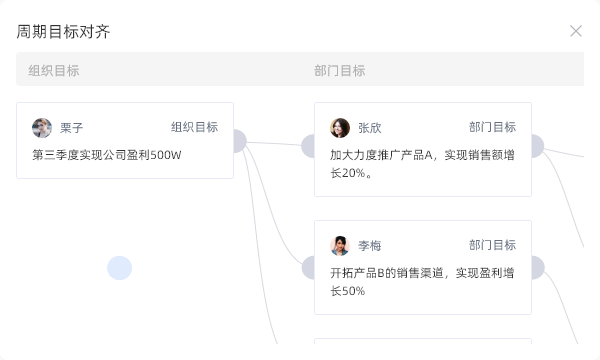 让团队上下一心,朝同一个方向努力;每个下级目标的完成都对上级目标形成有力的支撑;在对齐地图中能对周期全部目标有更清晰的认知。