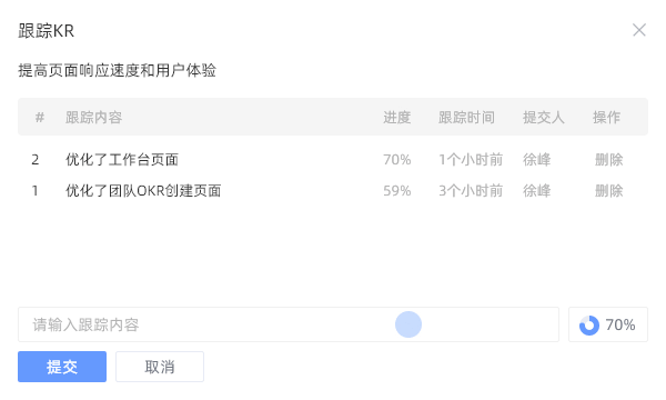 每个关键结果KR都可进行跟踪,记录KR的完成情况,包括跟踪记录和KR进度;团队成员皆可查看,实现自我驱动和鞭策。
