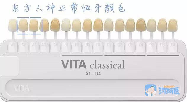 通常情况下,因为色素沉淀的关系亚洲人的牙齿普遍比西方人更黄。用 Vitapan classical 比色板作为标准,东方人种的恒牙一般白度在 A2 到 A3 差不多,西方人种会更白。