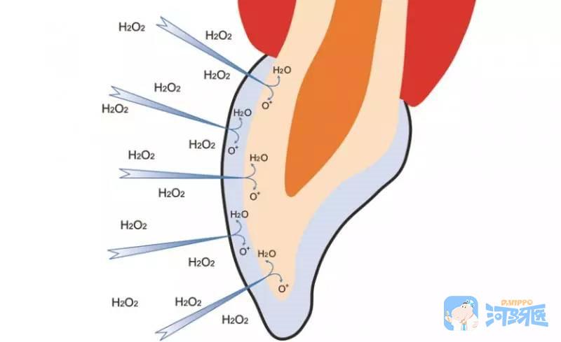 原理:通过氧化还原的方式,使牙面上的有机染色大分子(深色的)被分解成小分子(浅色的),从深色变成浅色,牙齿就达到了美白效果。