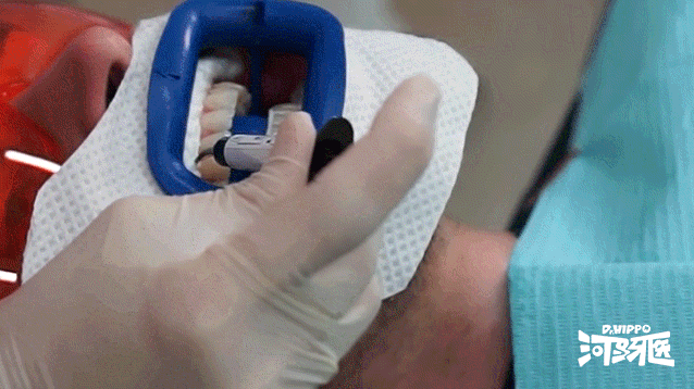 冷光照射:涂上美白剂后用波长介于 480 - 520 纳米之间的高强度蓝光垂直照射牙面 8 ~ 10 分钟。