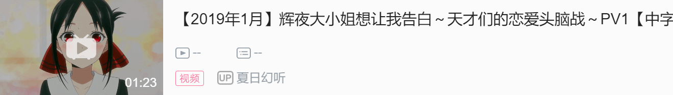 电视动画《辉夜大小姐想让我告白~天才们的恋爱头脑战~》改编自赤坂アカ创作的同名漫画,动画由A-1 Pictures负责制作,于2019年1月12日播出。