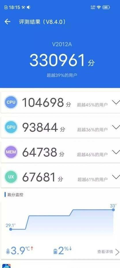 iQOO Z1x采用了超级液冷散热技术,所以手机表面温度都控制的不错,正面和背面的最高温度都控制在33℃左右,人体感觉还是比较舒适