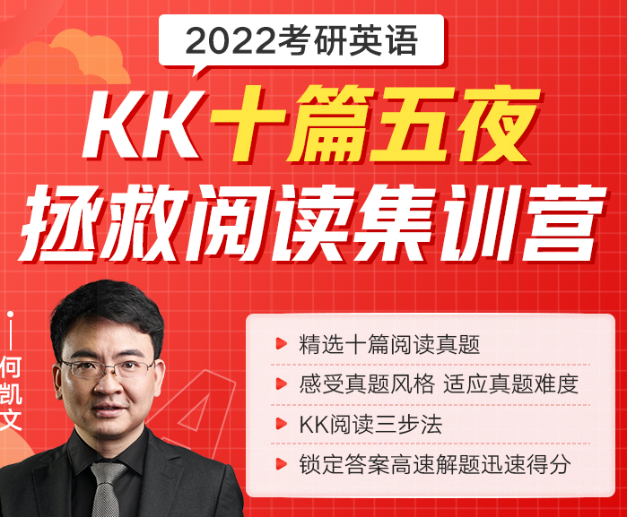 众所周知,何凯文老师的“KK三步法”广受欢迎,被历年考研学员称为“阅读得分神器”,在何老师的图书和往年的阅读课程中会做详细应用讲解。今年开始,在原有“KK三步法”基础上,何老师加入此前一直研究终于成形的“串读题干阅读法”,即在阅读“定位”之前,把五个题干先顺读一遍。何老师表示阅读题干很重要,比阅读原文和选项都应该更优先,因为原文和选项中其实有很多无关信息,但是题干都是最准确有用的信息。具体结合“KK三步法”使用,将在“kk十篇五夜拯救阅读”课程中做具体讲解。