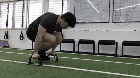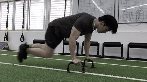 双手固定好,通过交替爆发式的抬腿来传导身体的力量,这里有两点需要注意: