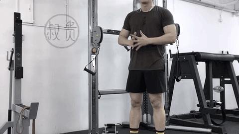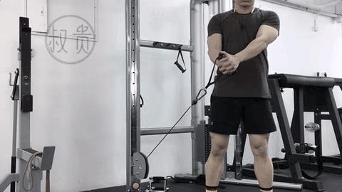 这个动作不仅可以用来帮助你强化肩部,还能够感知运动链,从髋部开始传递力量。你可以回忆一下使用龙门架做砍树,或者转体的动作,通常都是上半身有一个重量带来一个惯性,然后由髋部传递到下肢,完成整个动作。
