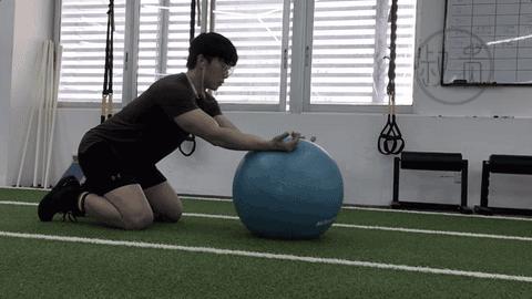 随着动作的熟练,逐渐的加大手臂和躯干角度,让球(健腹轮)远离身体。