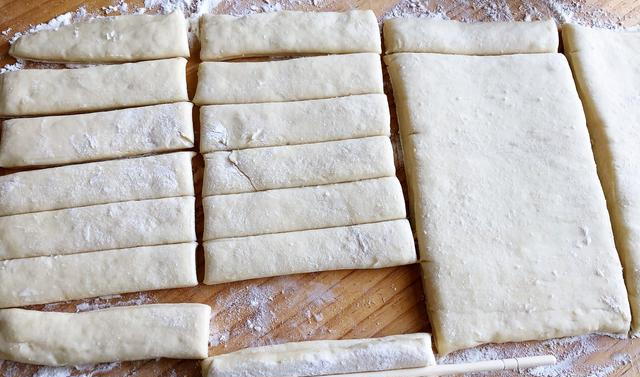 6:再切成小长条,有人会在案板上抹油防粘,我感觉抹点面粉会比较好操作