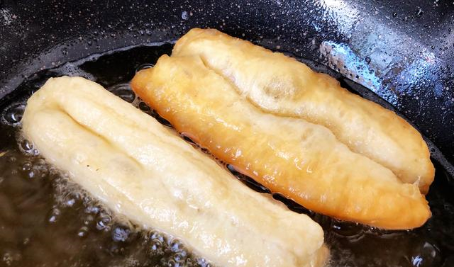 8:炸油条的锅要宽大一些,放足量的植物油,加热到扔个小面块进去,能迅速浮起而不变色……这时把油条拉长,放锅里炸,不断翻动油条,使其均匀受热,最后成金黄酥脆状捞出。