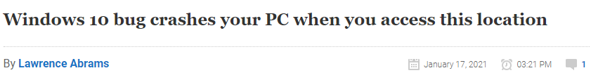 根据外媒报道资料来看,自去年10 月以来,Windows 安全研究员 Jonas Lykkegaard 就曾在推特上发表了多次推文,表示在浏览器地址中输入一条路径会立即导致 Windows 10 崩溃并显示 BSOD(Blue Screen of Death,缩写为: BSoD,俗称蓝屏死机)