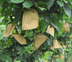 套袋方法:先套树冠上部的果,后套树冠下部的果。上下左右内外分布均匀,通常应当整个果园或整株树套袋。套袋时先把手伸进袋中膨起,一手抓住果柄或果枝,一手托起袋底,把幼果套入袋中,将袋口从两边向中部果柄处挤掐,再将铁丝卡反转90度,弯绕扎紧在果柄或果枝上,一定要把袋口封严,但不要扎得过紧,以免损伤果柄彰响幼果生长。套完后,用手往上托起袋底,使全袋膨起来,两底角的出水口张开,幼果悬空在袋中,不与袋壁贴附