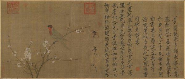 图绘折枝杏花两枝,枝头栖五色鹦鹉一只,用笔细劲工致,设色浓丽,与《蜡梅身禽图》想类,是一种精巧典雅的风格。因有徽宗赵佶的亲笔题词,历来系于徽宗名下,但当代学者普遍认为实出当时画院职业画家之手,体现了徽宗时画院花鸟画创作的水平。画幅的右侧有赵佶瘦金书诗序并诗,其形式与《祥龙石图》相近似,有的学者进而推测此作当为《宣和睿览册》中之一种。画上钤有元文宗「天历之宝」印,清戴明说、宋荦藏印及清乾隆、嘉庆内府鉴藏印,《石渠宝笈初编》著录。 赵佶这幅《五色鹦鹉图》在宋徽宗的作品中是数一数二的代表作。