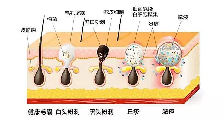 白头粉刺与黑头粉刺根出同源,开端与空气接触,皮脂被氧化为黑色为黑头粉刺;开端封闭未与空气接触的为白头粉刺。