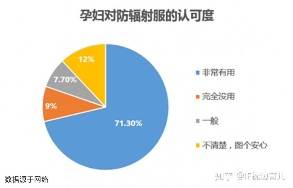 我看到过一个调查表,上面有71.3%的孕妈认为,防辐射服可以起到作用的,但也有12%的孕妈并不是很清楚,是否有用,只是图个安心。这个数据中,感觉防辐射服完全没用的孕妈,只占到了9%。