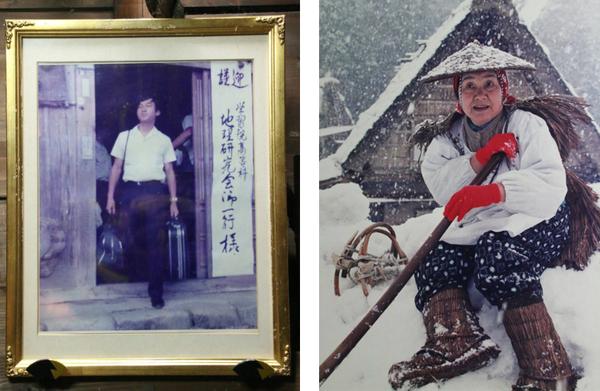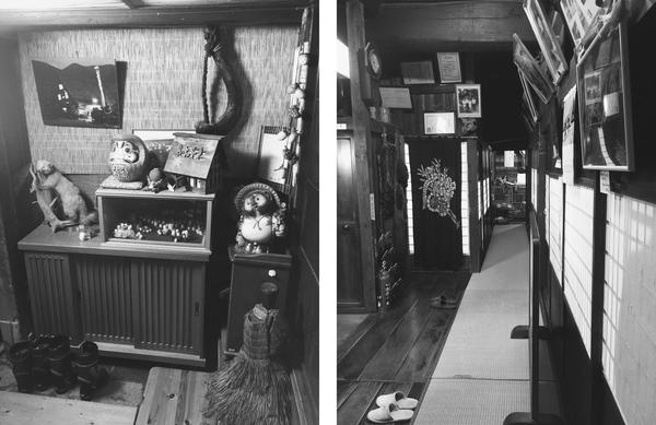 拖着箱子沿着缓坡向上,同一趟巴士而来的旅客都是要留宿一夜的。路过几家光鲜豪华的大屋,来客逐渐分流,直至道路尽头的明善寺附近才找到自己目的地:不起眼的外立面,正门被一排格栅遮掩起来。Furusato的主人是一对中年夫妇,简要引导之后便继续忙碌着。合掌屋的公共走廊里很拥挤,墙上则挂满了不同年代大小不一的相片、字画。从皇子的一瞥留影,到上一代女主人身披蓑笠的劳动英姿,仿佛是一座沉淀着历史,又充满着举重若轻般温情的家族博物馆。