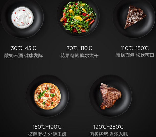 蒸烤一体机的温域很广,这就意味着能实现很多功能,温度可以低到30℃,也能高能达250℃,轻松掌控火候,实现各种操作。
