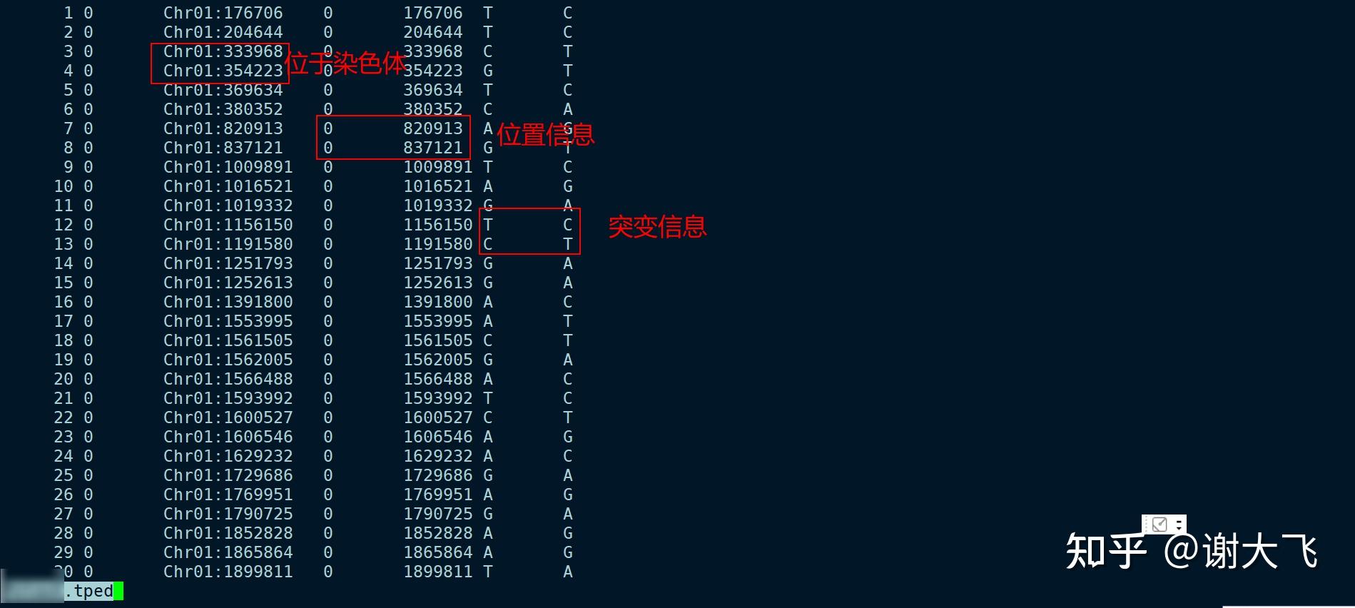 首先使用的是VCFtools过滤后的结果文件,其中包含变异存在的 染色体、位点及突变类型信息