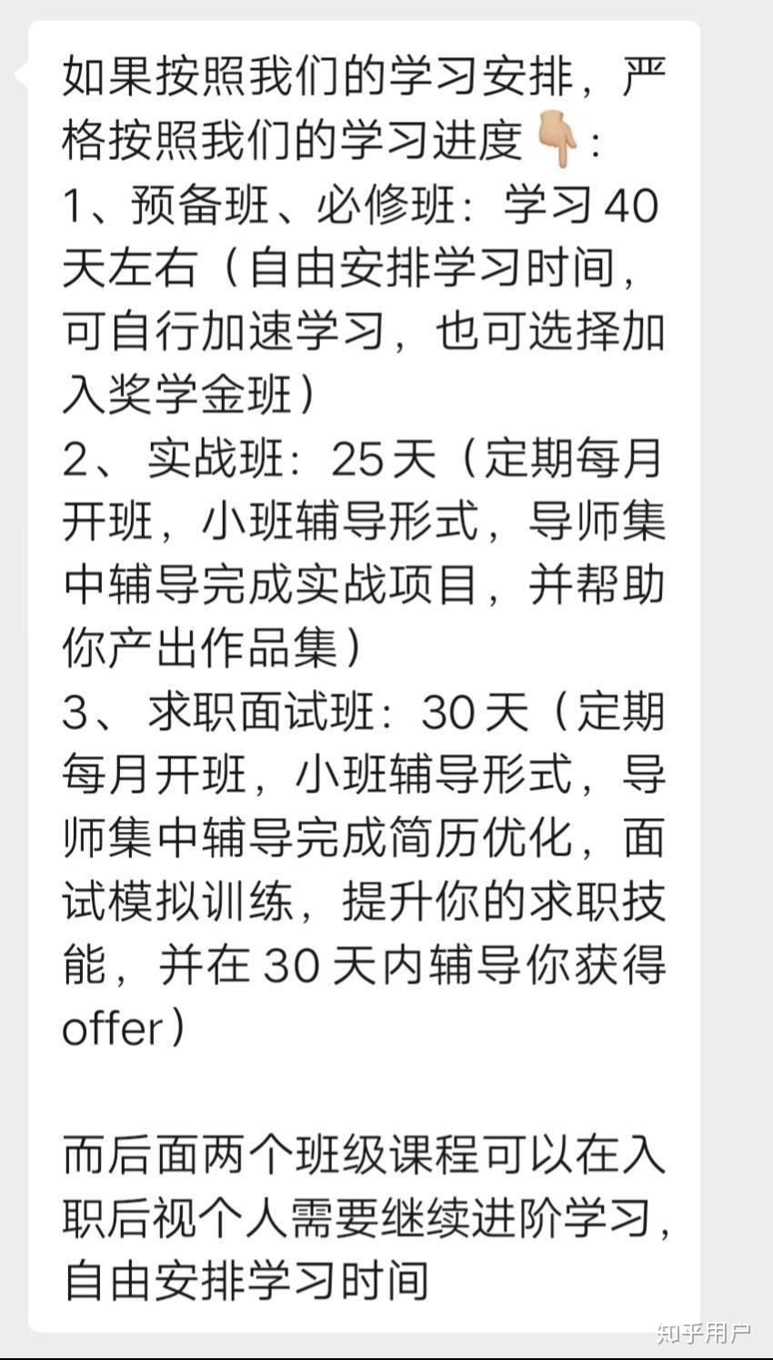 试听了之后我就确定了一家报名了,花了几千块大洋还挺心疼的,不过好在没让我失望,还是花得很值的。 课程分为三个阶段——必修班、实战班、求职班。