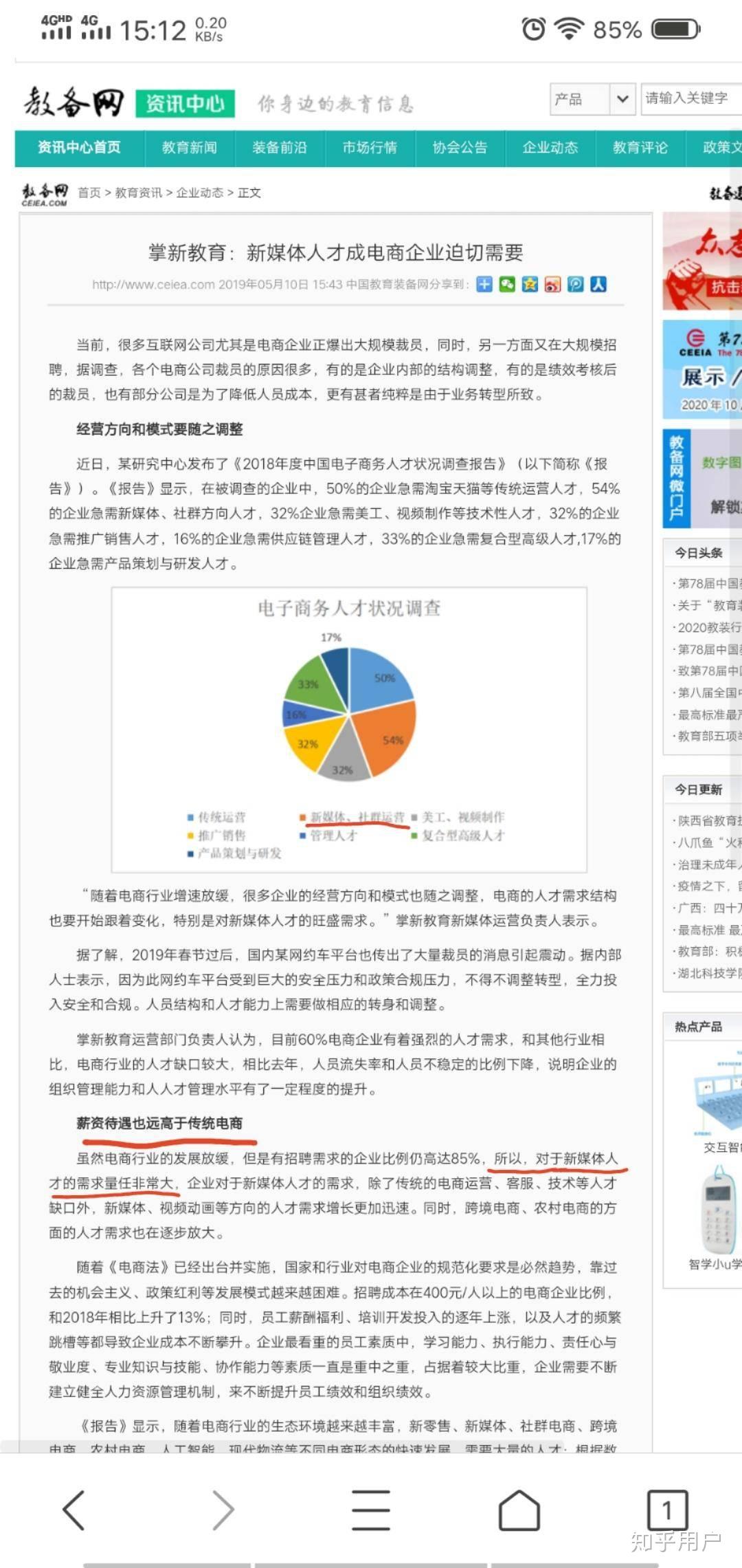 一来我的学历不高,做不了其他技术类的工作,二来我对新媒体感兴趣,而且在疫情的冲击下很多企业都纷纷投入到线上直播平台,更加让我确定转行新媒体运营行业,现在国内对于新媒体运营人才需求还是很大的,薪资也高于传统行业,这些我们可以从咨询中心查到。