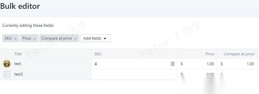 这时候出现的是在线批量编辑产品界面,默认情况下,你可以编辑sku,产品售价,和比较价格,标题默认是不能更改的。