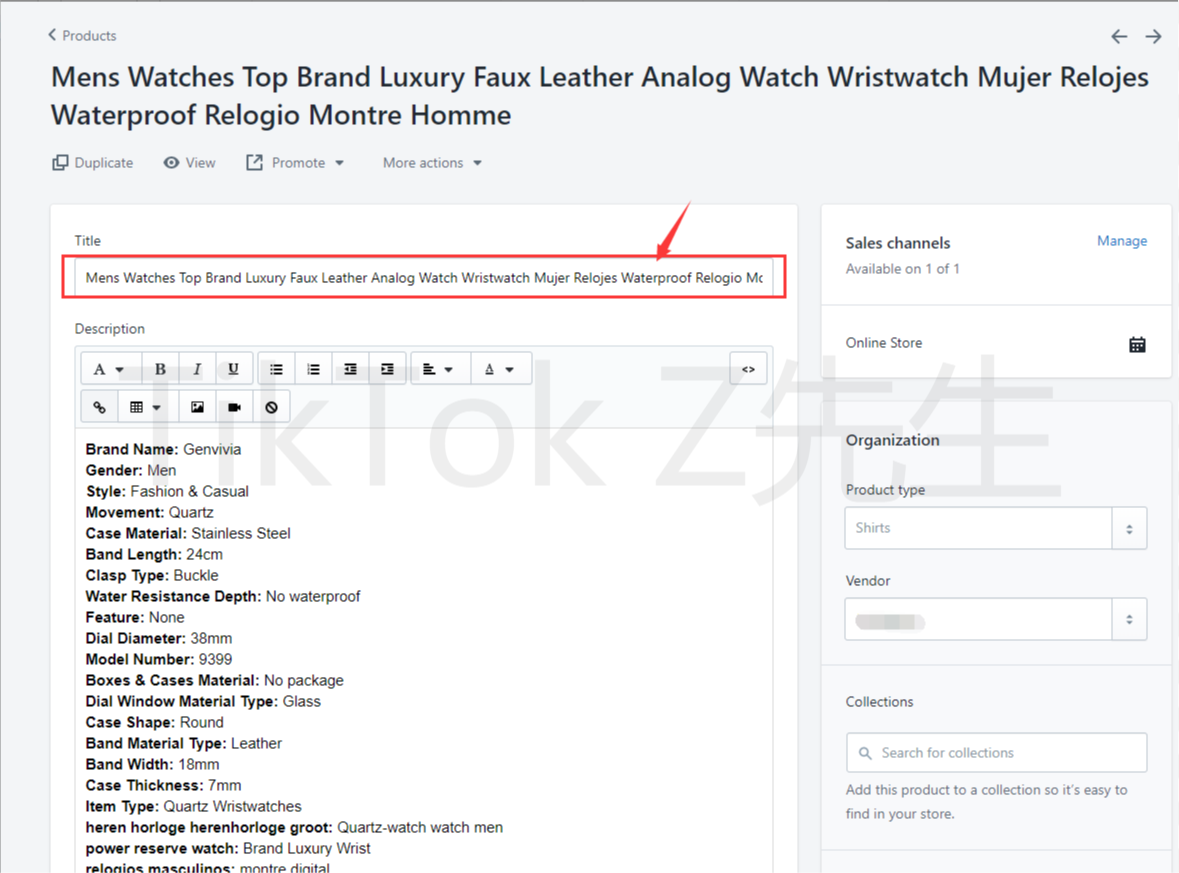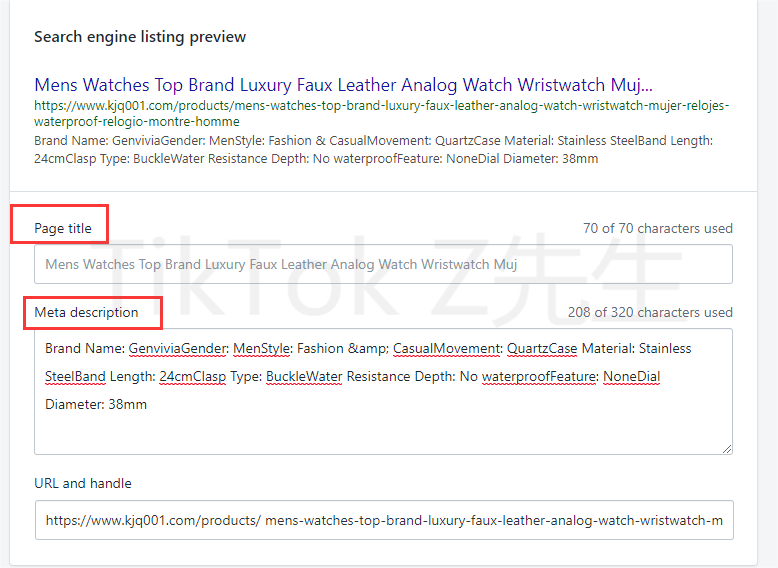 这个比较简单,就是我们的产品名称。如图所示后台的位置。不同的产品,title可以一样,但是产品的Handle即url是不同的,可以在url中标注产品不同的属性。例如:summer-skirt-xl,summer-skirt-s