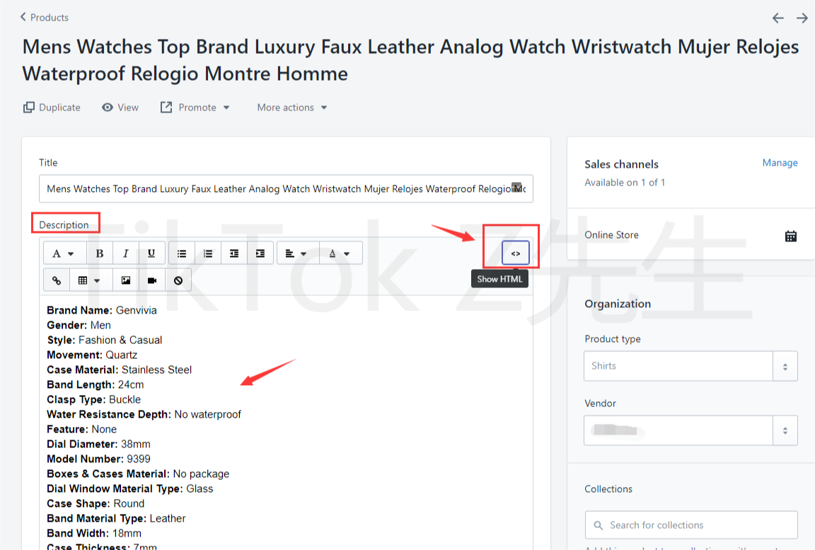 如果不懂html代码也没有关系,不知道大家有没有注意到在我们shopify后台描述这边有一个小小的像括号一样的符号,我们可以在这里编写完文字之后点击下show html就可以展现html代码了。如图: