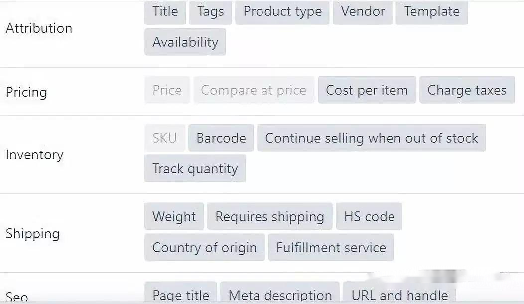 很多人下载了csv文件之后第一眼觉得一脸懵,怎么有这么多要填的数据,这些数据都是什么意思,怎么填,但其实看完这篇文章之后会发现我们把每一个都分解开,再跟shopify后台对应起来就一点都不难了,只是看我们肯不肯迈出第一步,只要尝试了就有了一个好的开始,接下来的步骤都没有那么难了。
