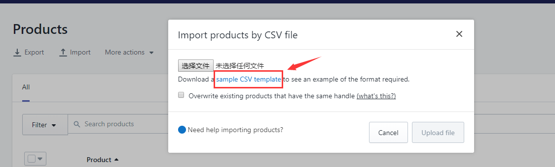 1. 首先我们进入shopify的后台,在product->import,选择下载一个示例csv文档。