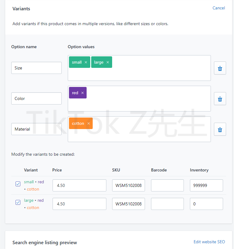 目前shopify只可以添加3种属性,对于大多数的用户来说这个是够用的,默认的属性是Size,Color和Material。不过这些都是可以自己修改的。变成想要属性。这里要注意的是单个属性值的数量限制为100,多个属性值的话,他们的乘积不能超过100。(就是说如果材质有10个的话,那么添加的颜色数量最多为10)。所以我们在填写表格的时候也要特别注意,先计算好之后再填写,以防添加的属性过多最后无法上传。