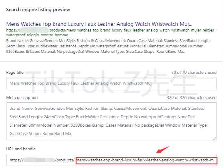 我们先从第一个Handle来看,这里显示的是我们产品seo部分的URL的后缀,可以是小写字母和数字,由“–”中划线连接,中间不能有空格。