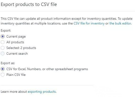 这个时候就要用到终极方案了,【导出导入大法】。所有需要批量编辑的产品批量导出,先选中要导出的产品,再点左上角的export,跳出来的对话框默认选项即可,点Export products。