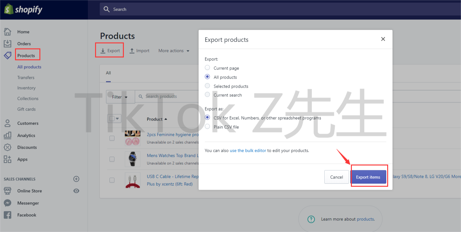 找到product->export,选择all product或者是部分产品都是可以的,选择CSV for Excel, Numbers, or other spreadsheet programs,点击export itemsj即可。