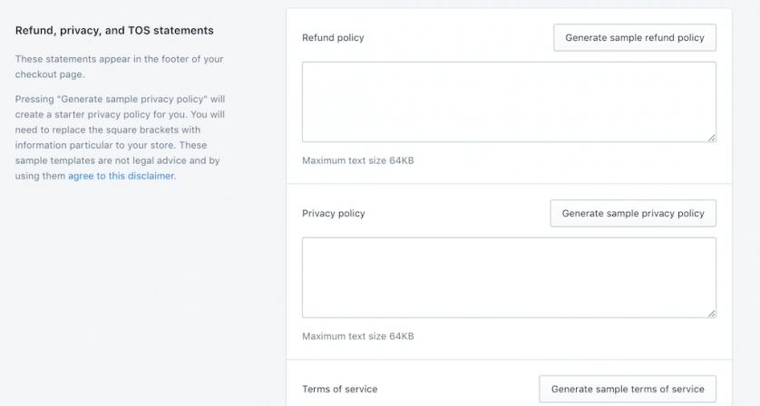 接下来,设置自定义结帐流程,Shopify 会为你完成大部分工作,但需要添加退款政策、隐私政策和服务条款。