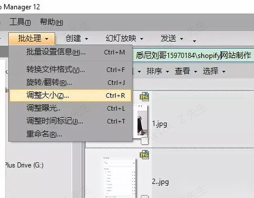 如图所示,把要压缩的图片放在同一个文件夹下,快捷键Ctrl+A,批量选中要编辑的文件,选择菜单中的【批处理->调整大小】,