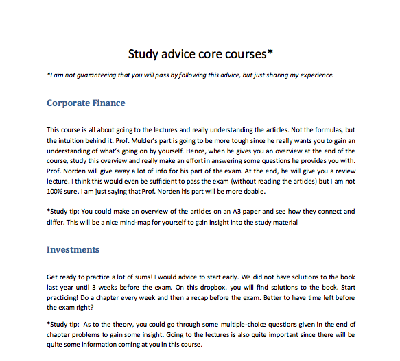 这是一个学长的学习意见,可以感受一下。这位学长的话要挑着听,这位学长是均分9.3毕业的,人很聪明,毕业后直接进 Deloitte 做咨询。他说可以随便看看的课,事实上通过率是不高的,Risk management挂了有一半的学生,补考貌似通过率也不高。