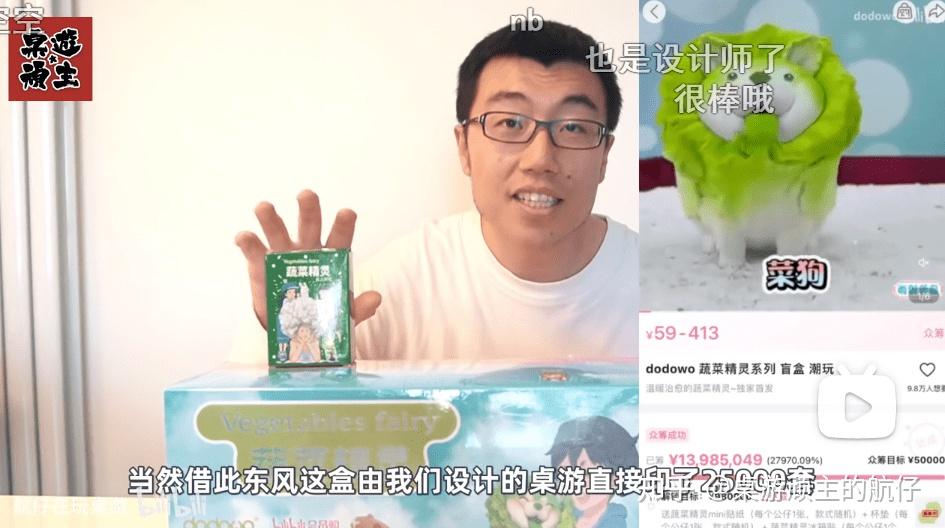 既然是第一章,那就 从《妖怪国度》的前身《蔬菜精灵》桌游 开始讲起,时间是2021年2月8日,“蔬菜精灵”盲盒当时正在B站众筹,已经筹到1400万元,解锁项已经到了解无可解的程度,这一天它的IP方朵朵窝找我,问能否一起设计一款游戏作为解锁。