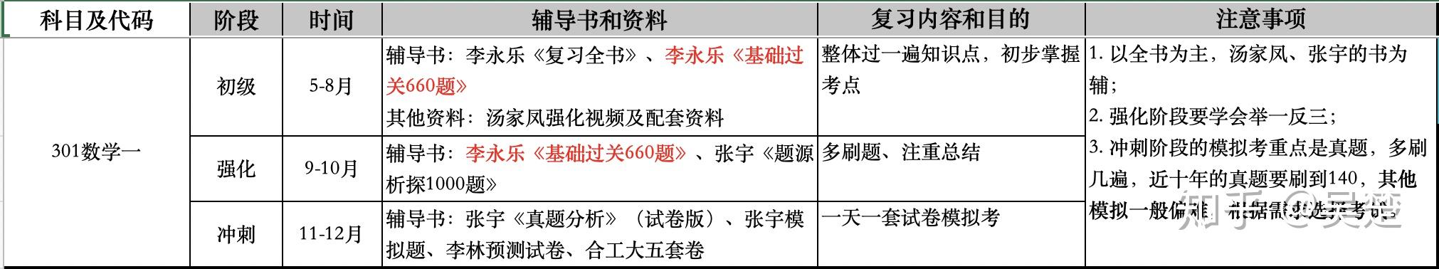 考研分三个阶段:表格中的绿色单元格表示 基础阶段 ;表格中的橙色单元格表示 强化阶段 ;表格中的红色单元格表示 冲刺阶段 。