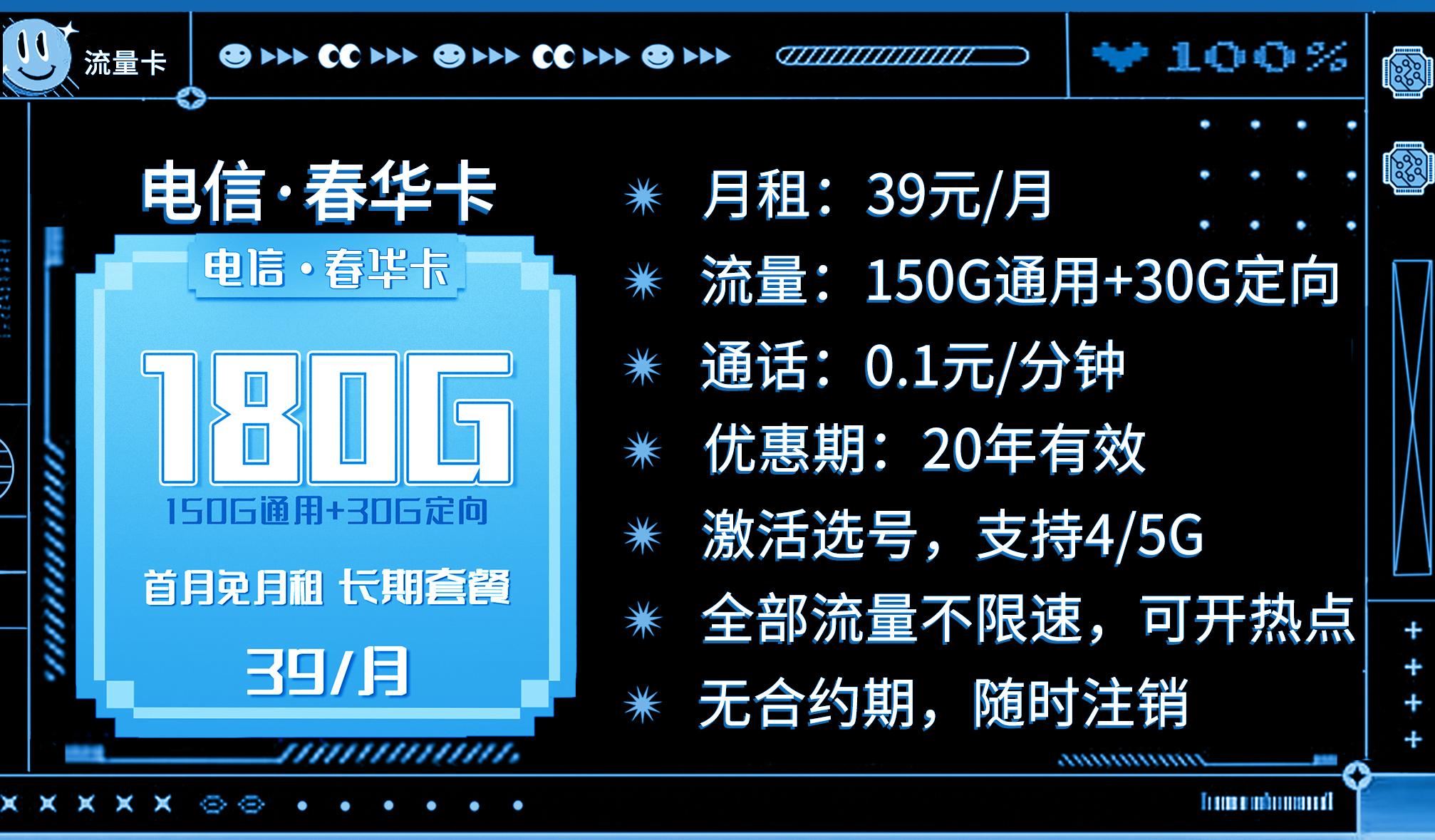同样的,春华卡也是目前为止电信唯一一款流量超级多且月租仍然保持39的一款套餐,并且还是长期套餐,激活即可享受20年优惠