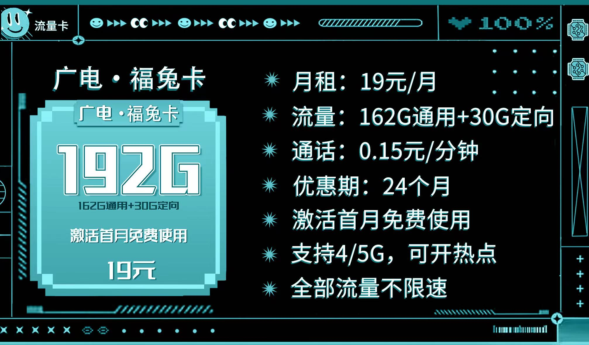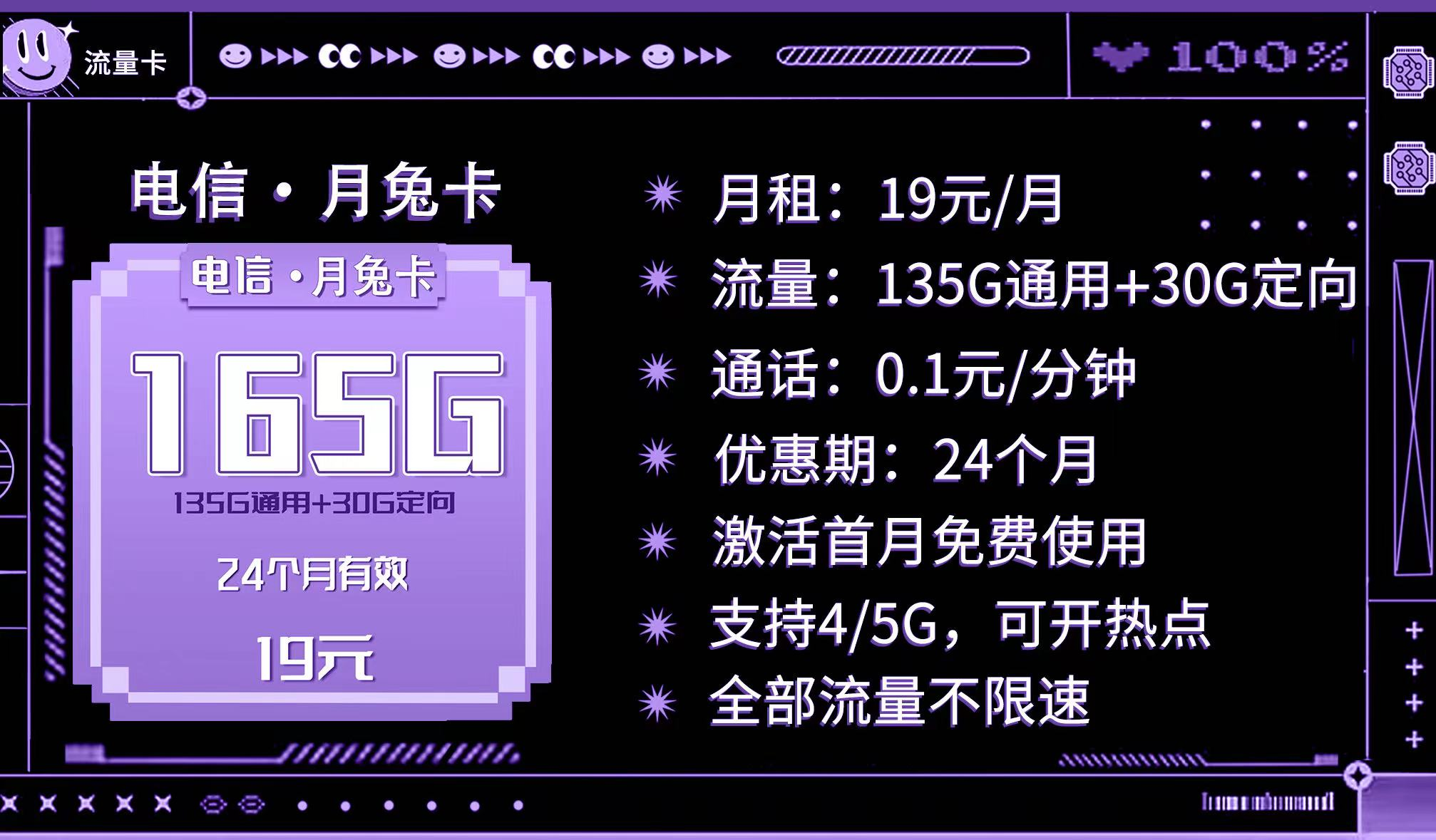 套餐内容:19元月租,105G通用流量+30G定向流量。