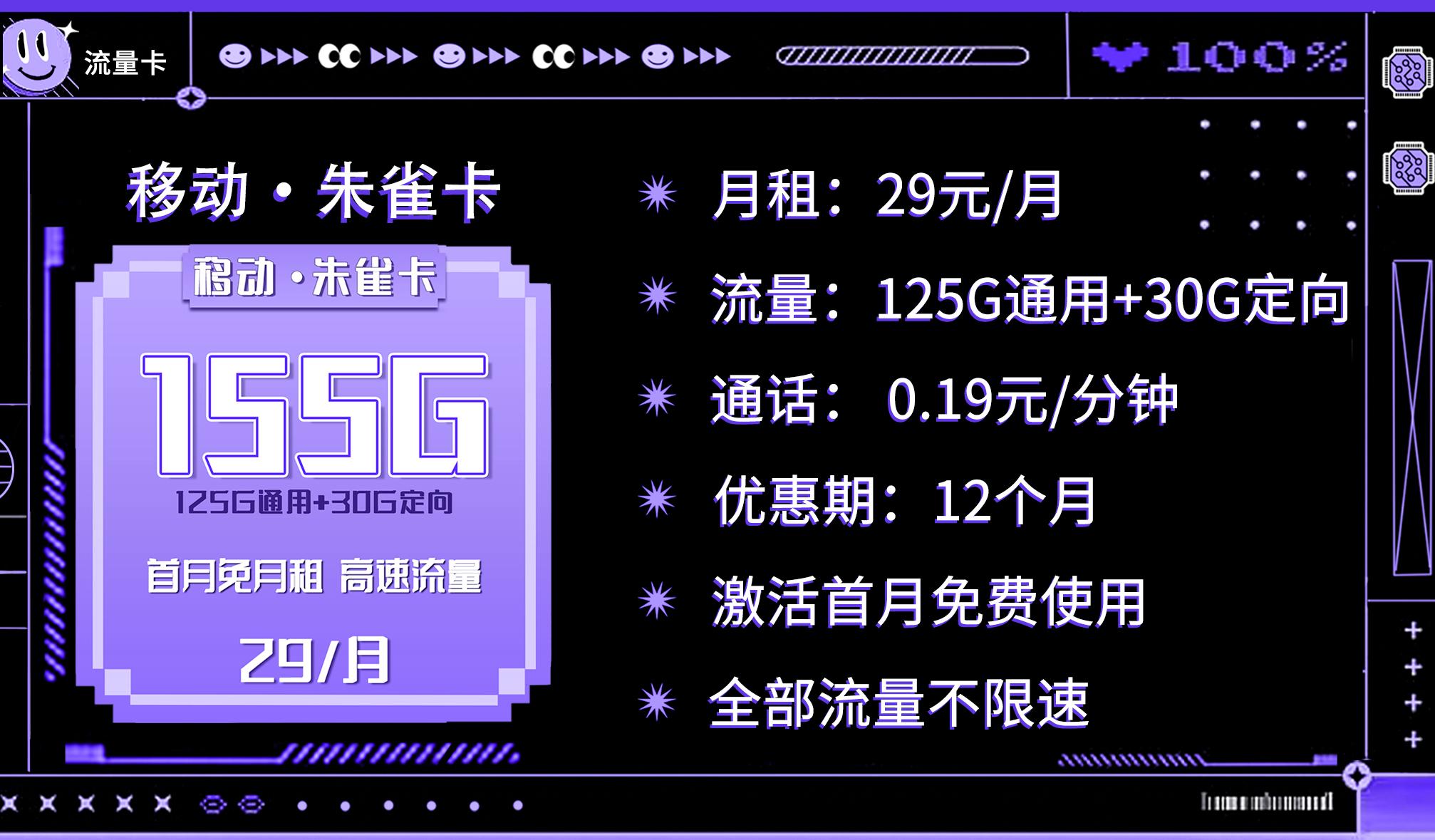 8、【29元155G大流量卡】·移动朱雀卡(超罕见移动套餐)