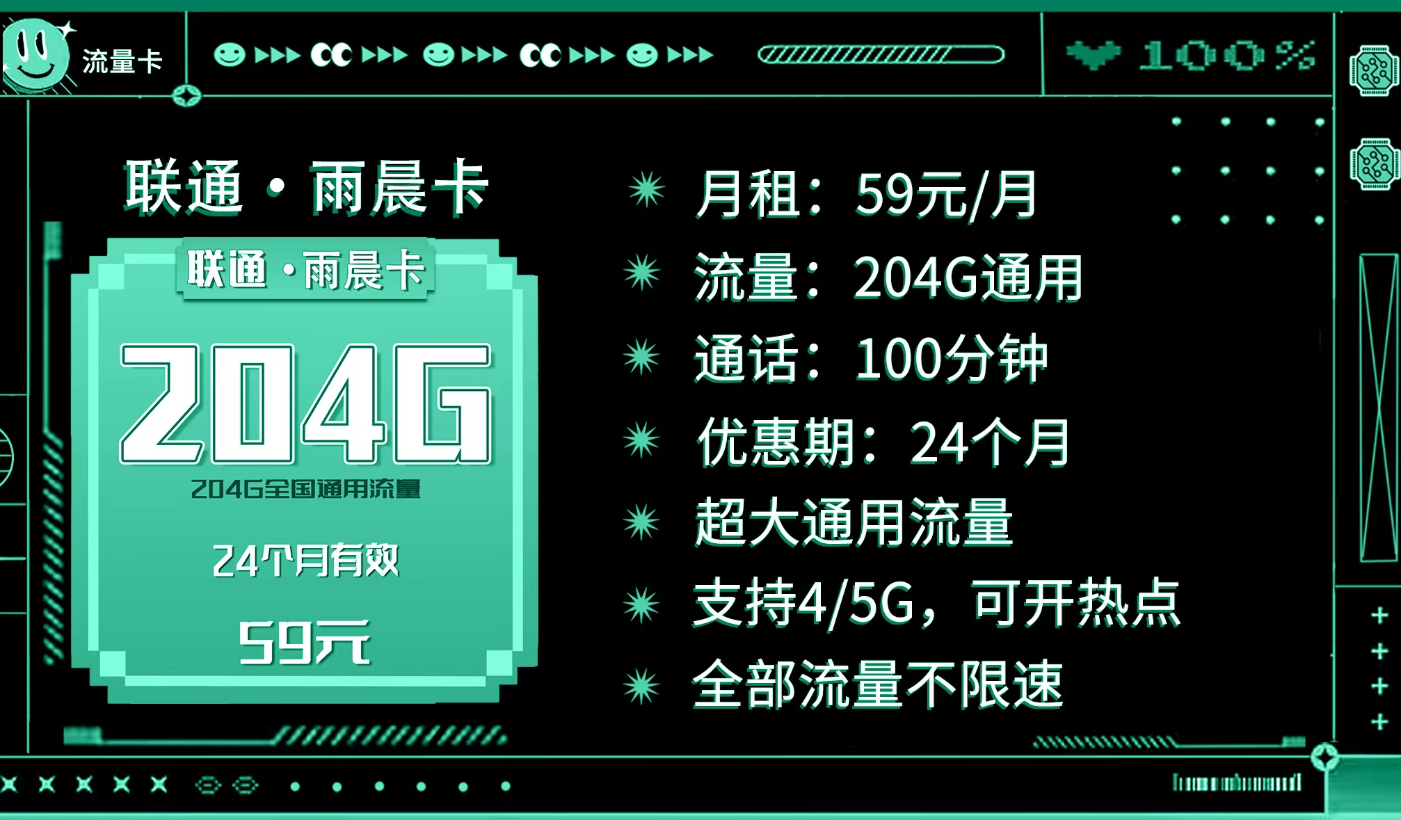 9、【59元204G通用流量】·联通雨晨卡(超大流量长期套餐)