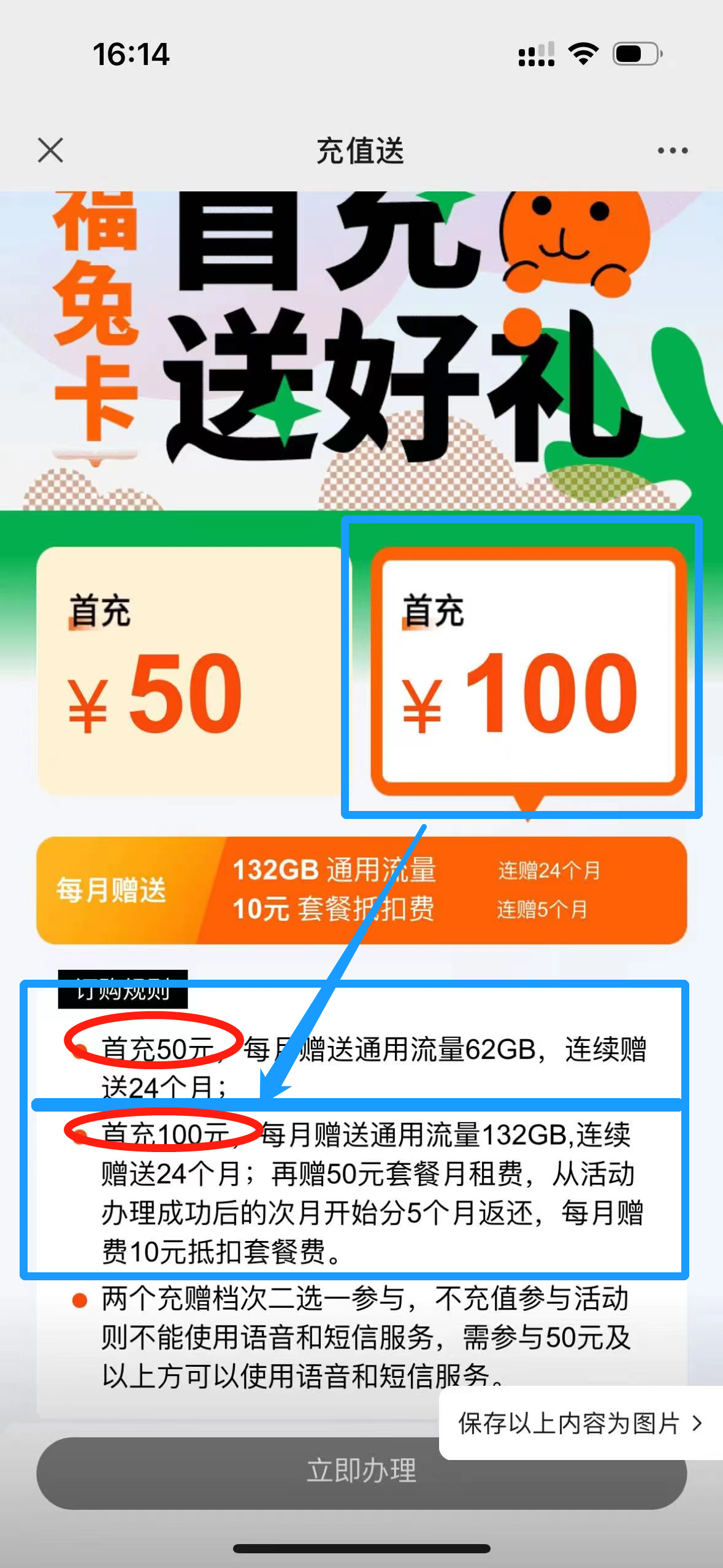 首充100激活后,48小时内叠加125G通用流量包+125G通用流量包费用减免包,实现0费用叠加流量包,后续每月月初结算日自动叠加。