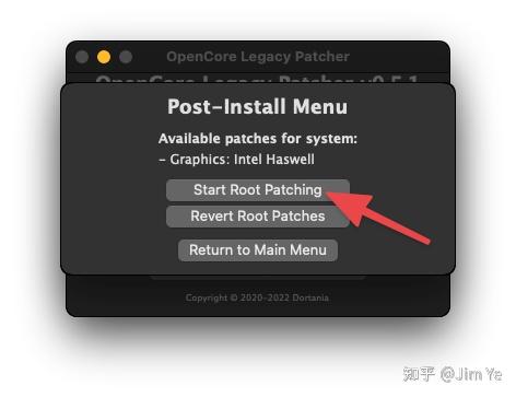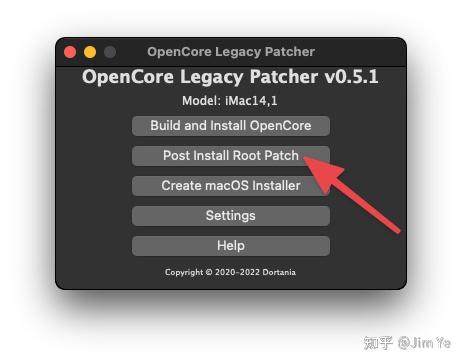 26. 最后,就是打补丁了。有一些老硬件,会遇到和我的iMac半透明模式无法显示等类似的问题。这时候需要重新打开 ”OpenCore-Patcher“ 应用程序,点击「Post Install Root Patch」。