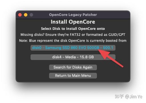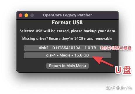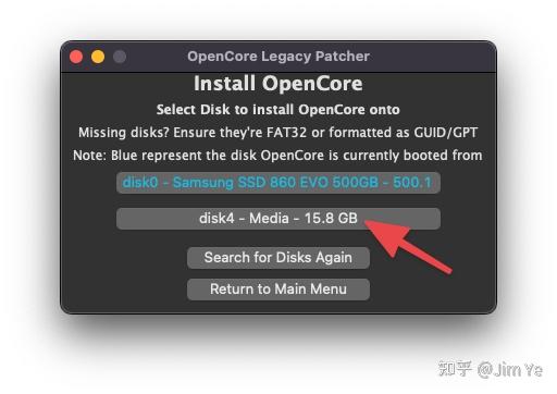 14. 在”安装 OpenCore“窗口中,选择我们之前插入的U盘。