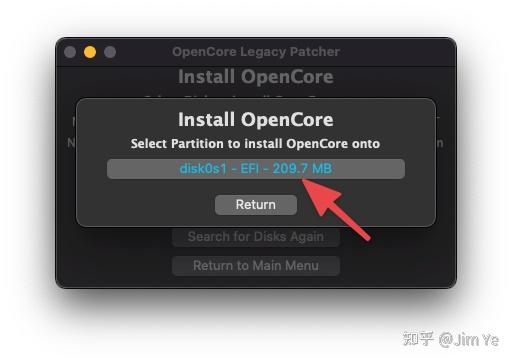 15. 然后,选择要安装 OpenCore 的分区。(这里应该只有一个选项,名字中带有”EFI“,这里系统还有可能让你输入管理员的用户名和密码,来授权挂载新的EFI。)