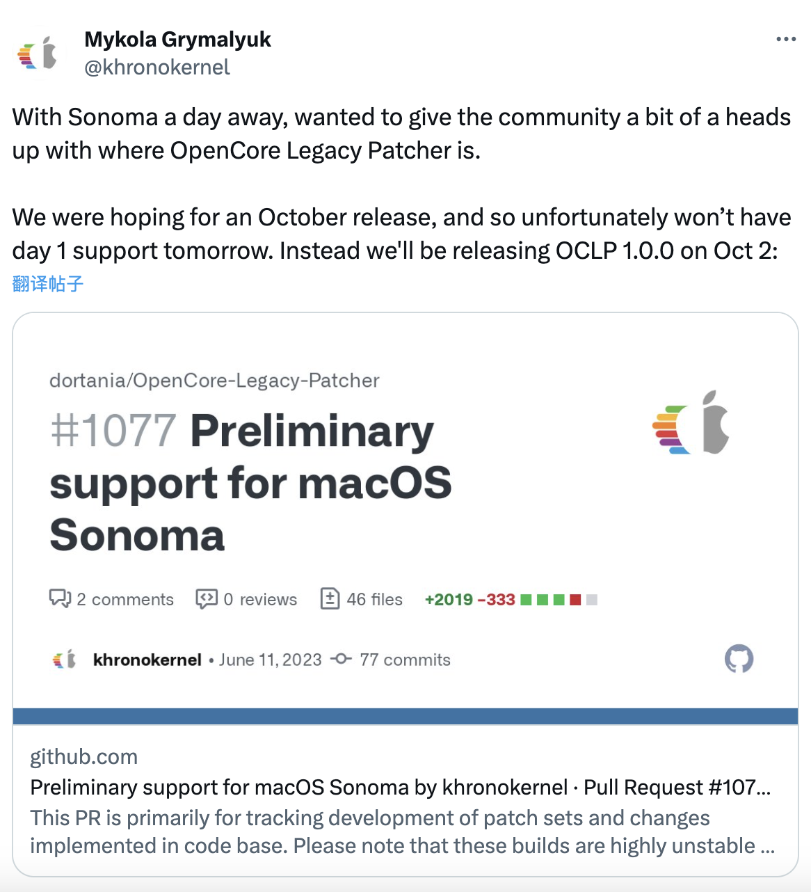 2023 年 9 月 27 日最新消息,今天 Apple 发布最新操作系统 macOS Sonoma了,这次 OpenCore Legacy Patcher 对其的适配遇到了很多困难,所以没有在发布之前完成适配,但是公告显示它的第一个适配版本预计会在 10 月 2 日发布。